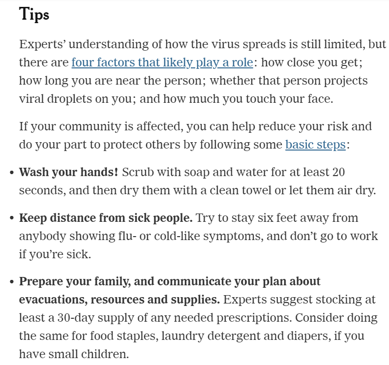 코로나 바이러스 관련 팁 또한 제공한다. 1. 손씻기. 2. 사회적 거리두기. 3. 최소 30일 이상 필요 생필품 구입.