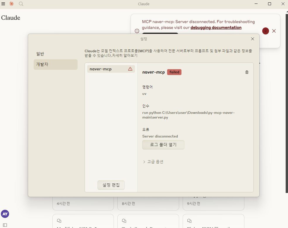 mcp install명령어를 시도했습니다.# 환경 변수 설정 후 (set 또는 $env:) uv run mcp install src/server.py -v NAVER_CLIENT_ID=... -v NAVER_CLIENT_SECRET=... --name "naver-mcp" - 결과: Claude 앱을 재시작했지만 여전히 "Server disconnected" 오류 발생.