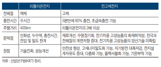 자동차 제조사들은 전고체 배터리 개발 경쟁에 사활을 걸고 있다. 전기차에 전고체 배터리를 쓰면, 리튬이온 배터리를 쓸 때보다 1회 충전 시 운행 거리가 월등하게 길어지기 때문이다. 자칫 늦었다간 전기차 시장에서 도태될 위험도 있다. 앞으로의 전기차 시장의 행보가 주목되는 시점이다.