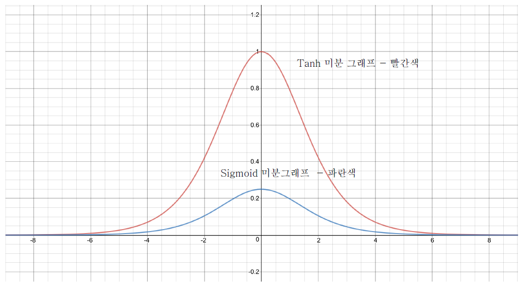 Tanh - 빨간색, Sigmoid - 파란색 미분 그래프