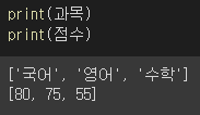 우선 각각 과목과 점수 변수를 만들어 주고, 리스트 자료형으로 넣어주겠습니다.