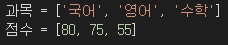 우선 각각 과목과 점수 변수를 만들어 주고, 리스트 자료형으로 넣어주겠습니다.