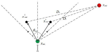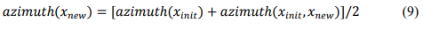 그림 4와 같이, 본 논문은 두 가지 측면에서 RRT 알고리즘(Kalisiak and Panne 2006)을 개선했다. 최대 회전각 βmax = 70°는 새로운 무작위 포인트의 공간을 제약하는 데 사용된다. 랜덤 점과 목표 점 사이의 거리는 랜덤 점 대 목표 점의 접근 속도를 향상시키기 위한 기준 요인이다. 이외에도 자율주행차와 신형 랜덤닷의 장애물 간 충돌 감지 이전에 새로운 랜덤닷에서 자율주행차의 고도화 방향을 획득할 필요가 있다. 다음 공식이 묘사한 것처럼, 차량의 새로운 방향은 초기 값과 초기 지점에서 새로운 무작위 지점까지의 값 사이의 평균값이다.