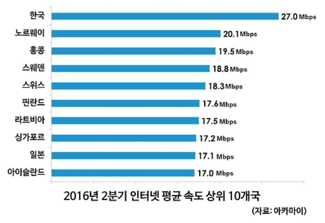 2016년도 2분기 인터넷 평균속도가 나옵니다. 아카마이라는 곳에서 발췌한 자료입니다. 한국이 인터넷 속도는 1위로 나오네요. 참고로, 아카마이는