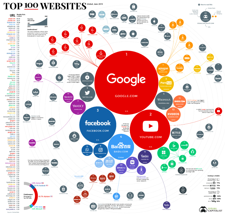 웹사이트 순위 그림에서 가장 크게 '구글'이 보입니다. 그다음 '유튜브', 그다음 '페이스북'.