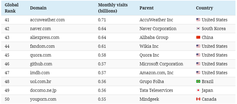 다음은 세계 웹사이트 Top 100 순위입니다.