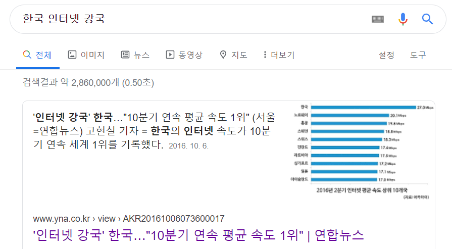 인터넷 강국의 기준은 뭘까요? 구글에 한국 인터넷 강국을 쳐보았습니다.