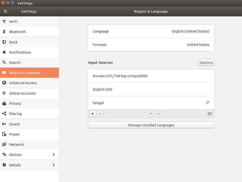 Region&Language 를 누르고, Manage Installed Languages를 눌러줍니다.