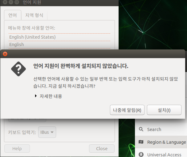 언어지원이 완벽하게 설치 안되었다고 메세지가 나오는데, 설치 버튼을 눌러줍니다.